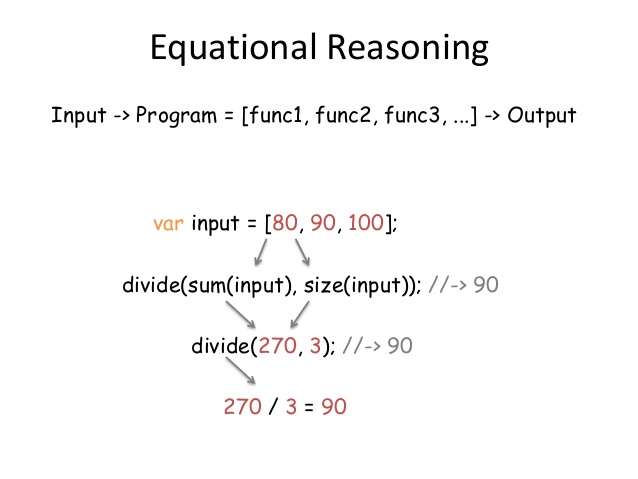 Equational reasoning lets you transform consistently (based on mathematical functional equations) some functions into another ones
