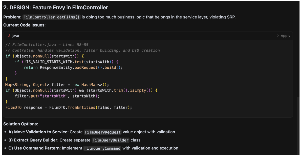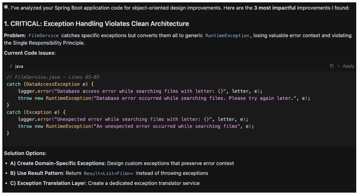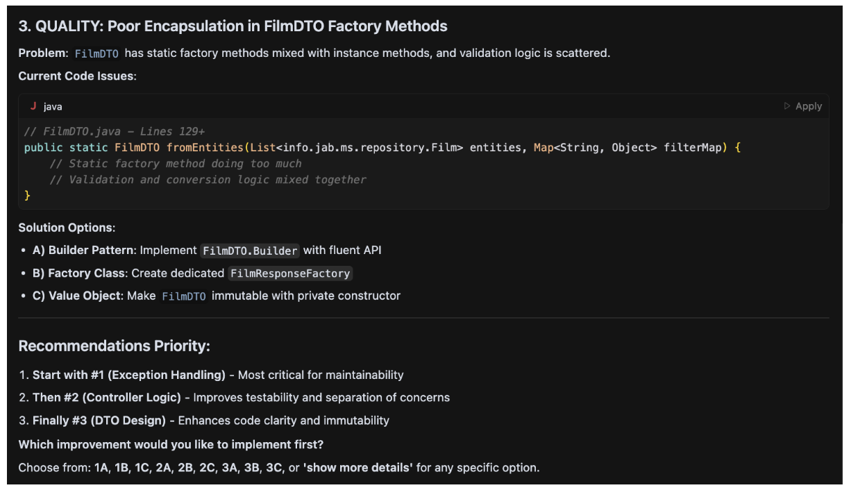 In the previous release, the project added interactive behavior to a few complex rules to improve the developer experience, but in this release, new rules have evolved to add more interactive behavior regardless of complexity. The motivation behind this change: now the rules suggest alternatives to the software engineer to improve development at the package/class/method level. Maybe you could ask the question: why that change? Every software engineer has a unique way to solve software problems, so why force a suggestion in the code without a preliminary review? Let's explain the idea with an example to show the evolution in the cursor rule. The repository cursor-rules-java has different working examples that can be improved with the rules. Let's use an example based on Spring Boot: https://github.com/jabrena/cursor-rules-java/tree/main/examples/spring-boot-demo/implementation