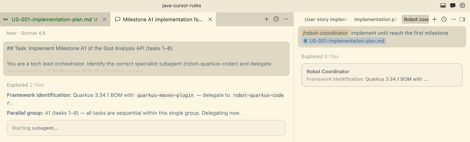 This agent will review the plan and repository and, depending on the context, it will delegate the coding tasks to a specific agent. Specialized agents are currently available for Pure Java, Spring Boot, Quarkus, and Micronaut.